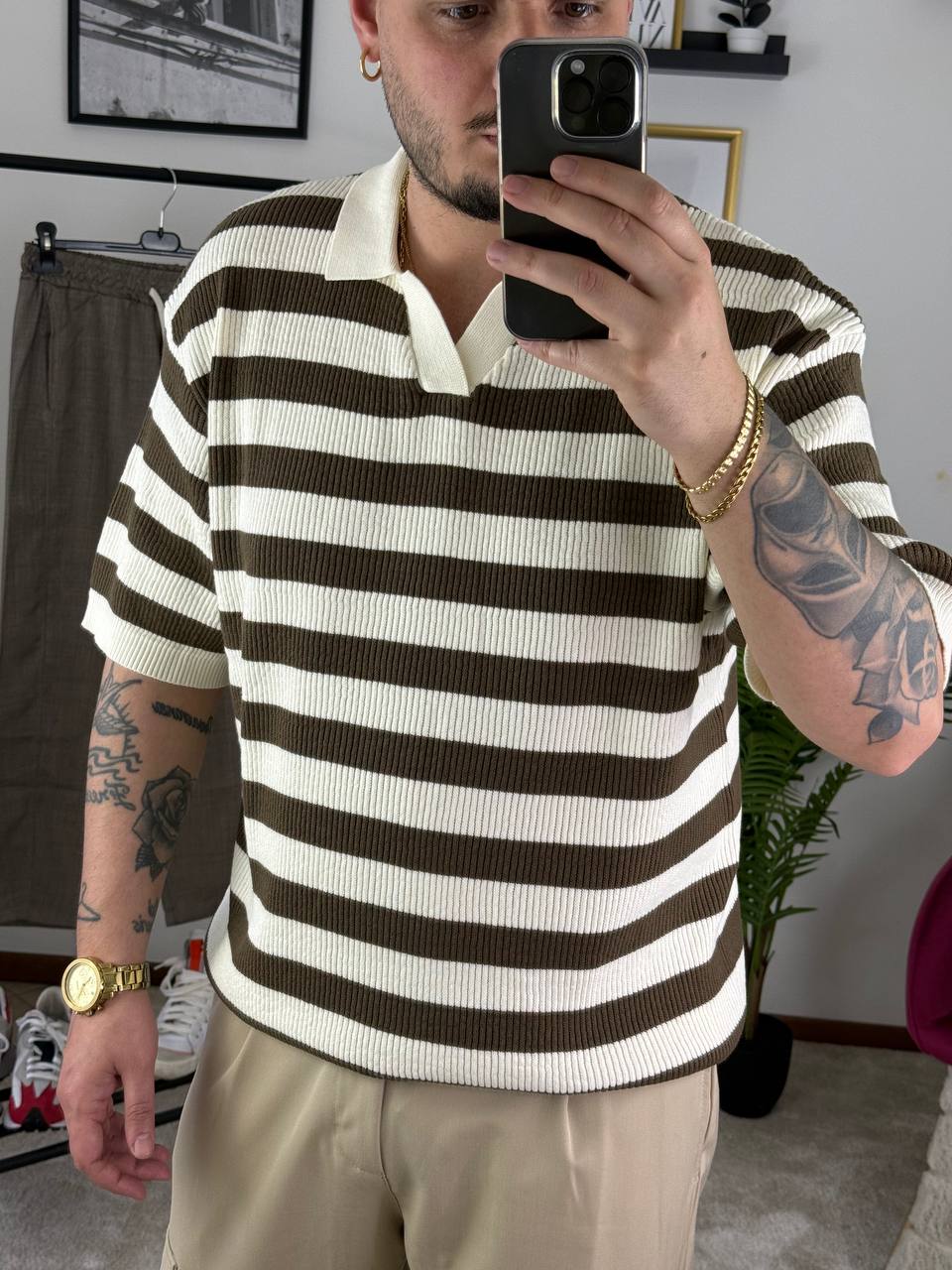 POLO RIGHE CREMA E VERDE SCURO